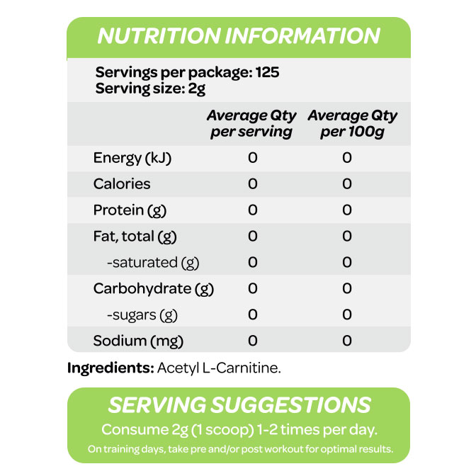 Add 1 serve (2g) of acetyl l-carnitine powder into 250-350ml of cold water or your preferred drink. Mix well.