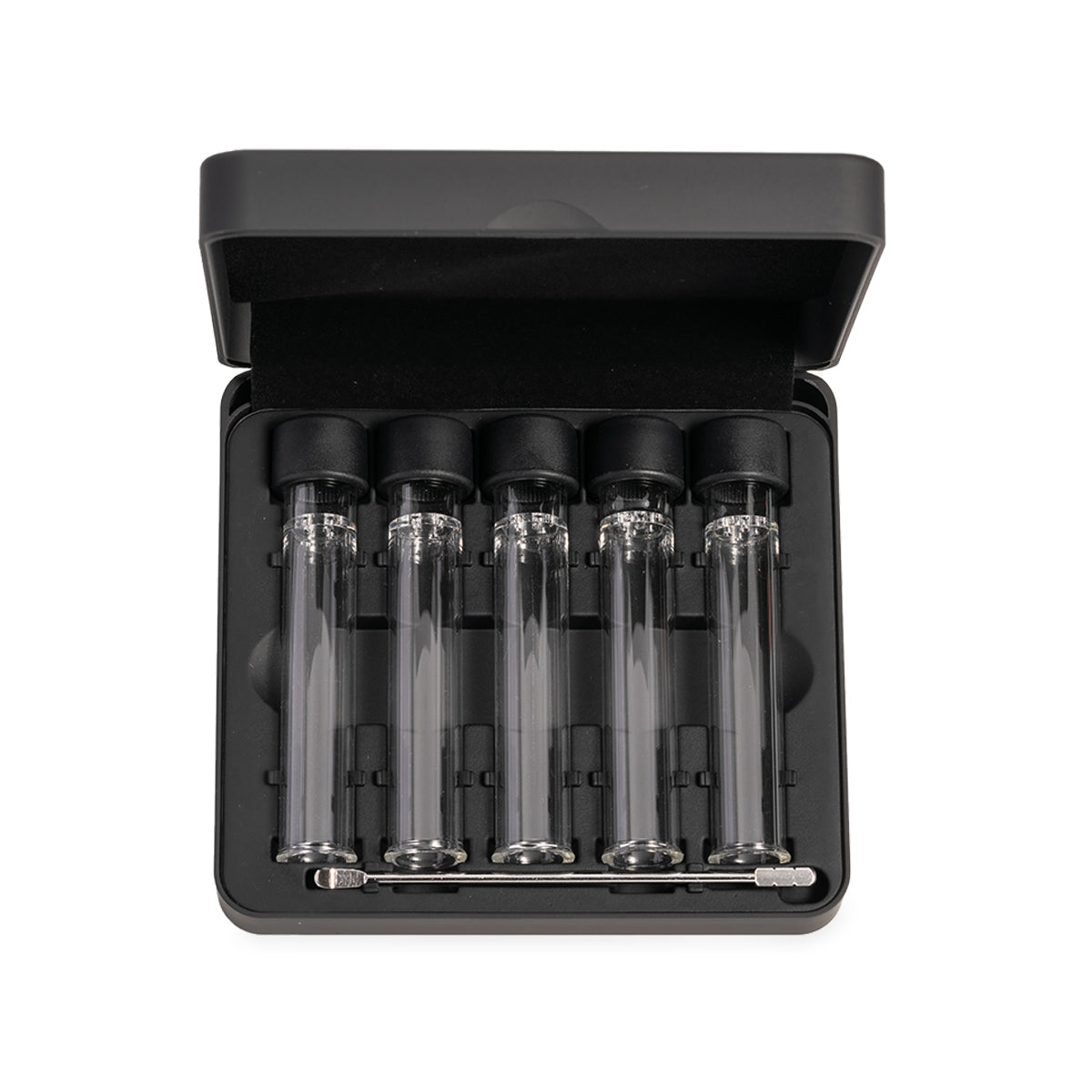 The stems come packaged inside an odor-reducing hard case with foam slots to keep each stem secure and in place, and a small slot for the included stir tool. Travel in style and with peace of mind.