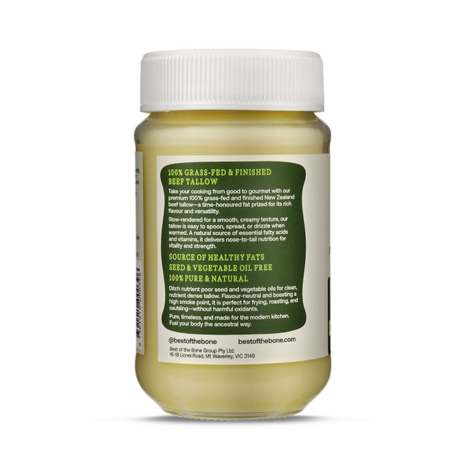 Take your cooking to the next level with Best Of The Bone’s premium Beef Tallow. Sourced from 100% grass-fed New Zealand cattle. Slow-rendered for a smooth, creamy texture, this flavour-neutral fat is perfect for frying, roasting, sautéing, or spreading.