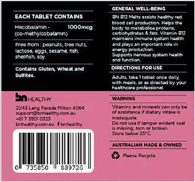 BN B12 melts are strawberry-flavoured tablets that dissolve quickly under your tongue. They are a great and simple way to help prevent dietary Vitamin B12 deficiency, delivering 1000mcg of Mecobalamin Vitamin B12 in every tablet.