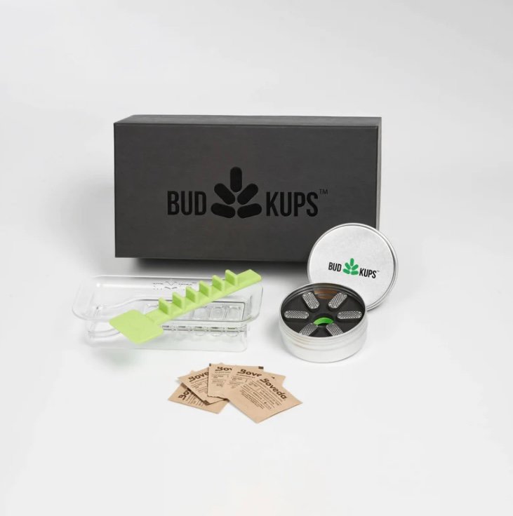 Contains: 6 BudKups, the Packing System, the Pocket Humidor and 2 Boveda Humidity Control Packs. Updated design for compatibility with BudKups 3.0 and Original BudKups.