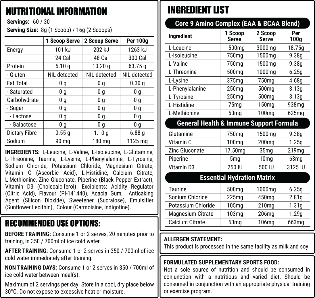 Mix one (1) scoop of Core 9 in 350ml of water or two (2) scoops in 750ml, and consume before or after training. Maximum of 2 servings per day.