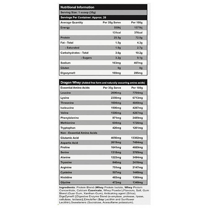 With the addition of DigeZyme, a multi-enzyme complex that promotes digestion, Dragon Whey ensures that the protein is easily absorbed by the body.