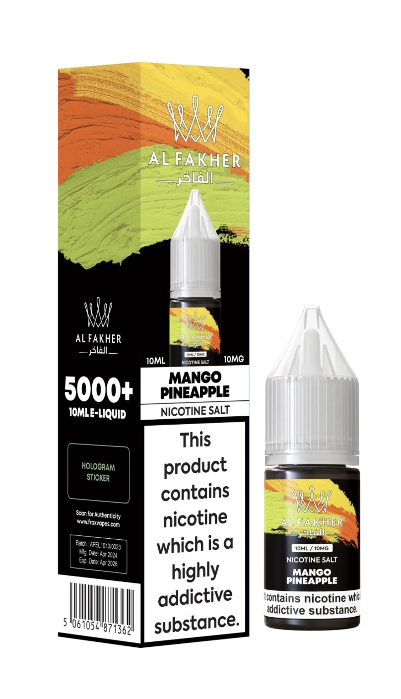 Al Fakher Nic Salts provides nicotine salts in 10mg strengths, crafted to deliver smooth throat hits and consistent nicotine satisfaction.