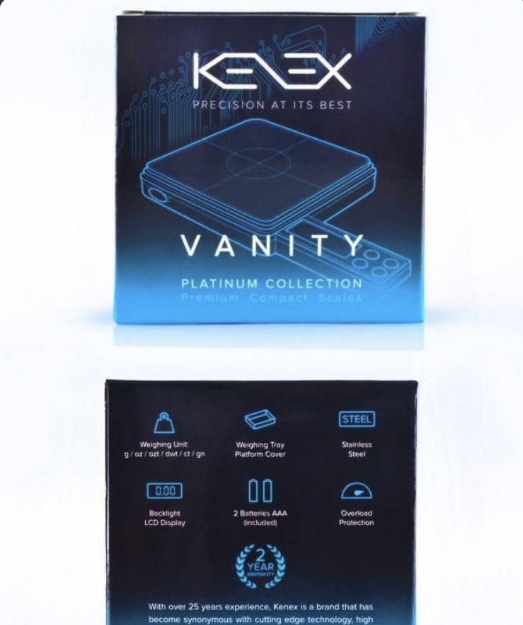 The Vanity scales are a hardy pair of scales due to it’s small discrete size, shape and high quality stainless steel. Featuring 6 seperate weighing units, overload protection and a backlit LCD display aswell as a weighing tray that doubles up as a protective platform cover, the Vanity scales by Kenex instills absolute confidence in the user when weighing valuables down to the one hundredth of a gram.