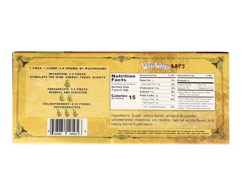 Immerse yourself in the velvety indulgence of Milk Chocolate Willy Wonky Happy Blend Bars. Crafted with the finest milk chocolate, each piece is a celebration of smooth, heavenly goodness. Infused with Happy Blend mushrooms, the bar contains 3750mg, with 250mg per delightful piece. Tailored for microdosing, enjoy 1-4 pieces for a gentle, euphoric lift. With 15 pieces per bar, it’s not just a chocolatey treat but also a journey into happiness, seamlessly blending the joy of milk chocolate with the wellness benefits of Happy Blend mushrooms.
