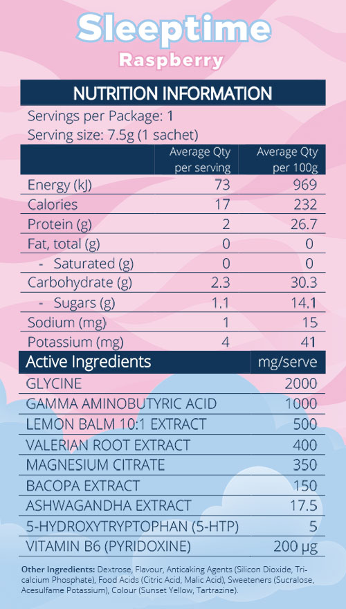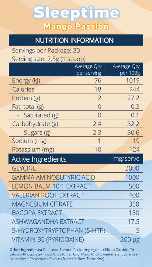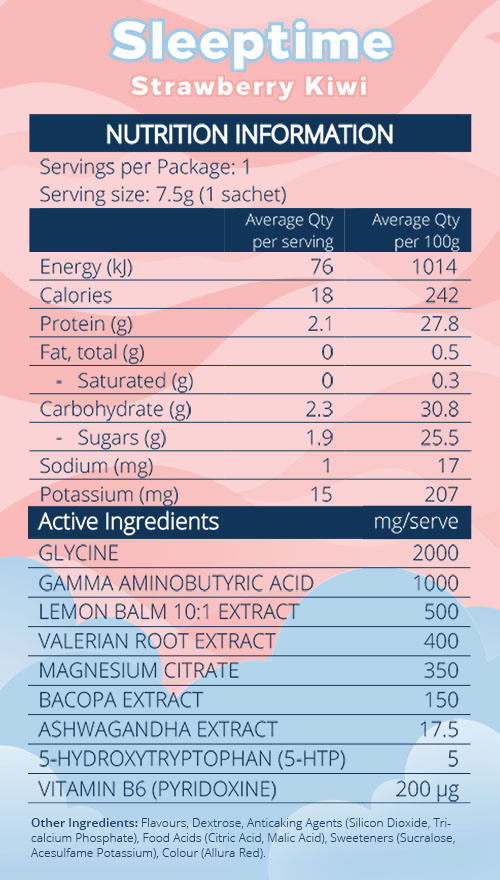 Begin your wind-down routine by mixing one (1) scoop (7.5g) of Sleeptime into 250mL of water 20 – 30 minutes before bedtime. We recommend cold or room temperature water. Stir until fully dissolved and sip away…