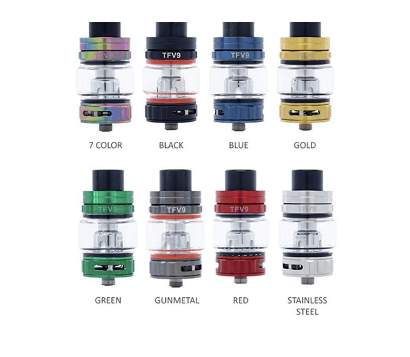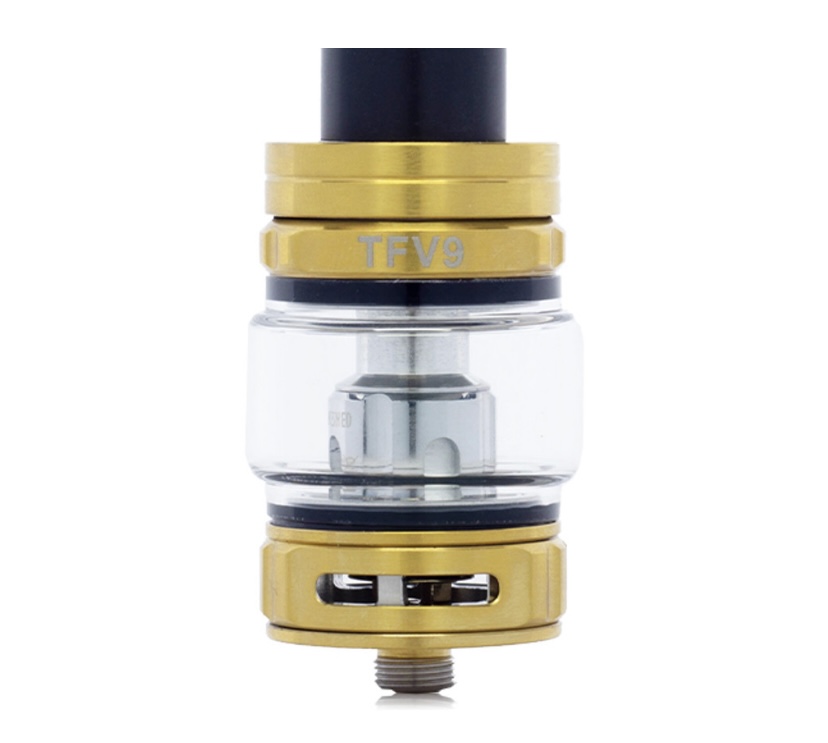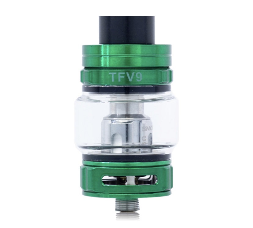 SMOK TFV9 Tank, the newest member of SMOK TFV tank series from SMOK. This tank is constructed with high-quality stainless steel and heat-resistant glass and sports a 5.0ml e-juice capacity. It has a top fill design for easy refilling on the go, and the airflow is manipulated with its dual slotted bottom air flow ring. the TFV9 Tank is compatible with the new V9 mesh coil series for massive clouds and amazing flavor.
