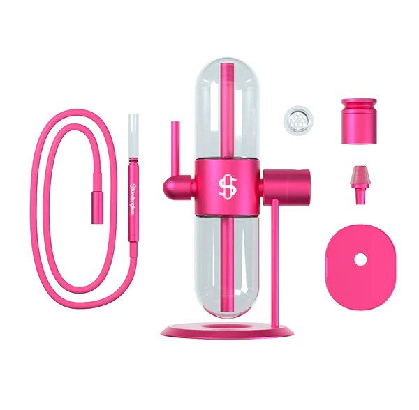 Designed for functional versatility, the Stündenglass Gravity Infuser is a complete set that includes an aluminum bowl kit and a glass liner, but can also connect to any smoking or vaporization device with a 14mm male joint. Included is a 3-foot silicone hose that can be connected for direct draws, though a steady stream of smoke through the 45° adjustable mouthpiece affords the optionality for entirely contactless consumption.