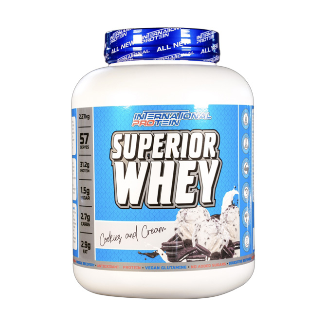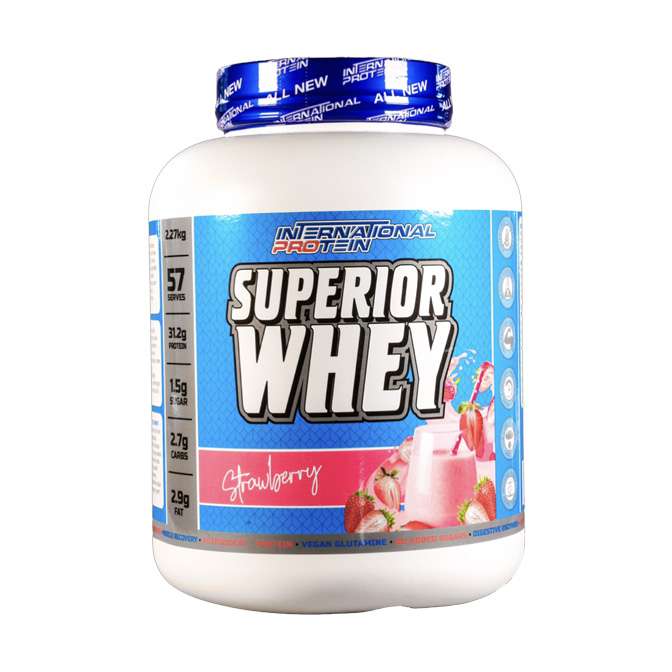 International Protein’s delicious Superior Whey is a high protein, low-fat supplement packed with Whey Protein Isolate, Whey Protein Concentrate and Whey Peptides formulated to support your muscle-building goals and facilitate recovery. Superior Whey blend is free of aspartame, fillers, stabilisers, vegetable gum and soy proteins.