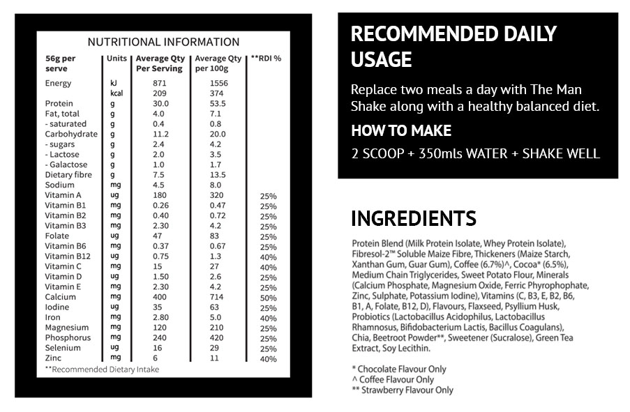 Replace up to two meals a day with the Man Shake along with a healthy balanced diet.